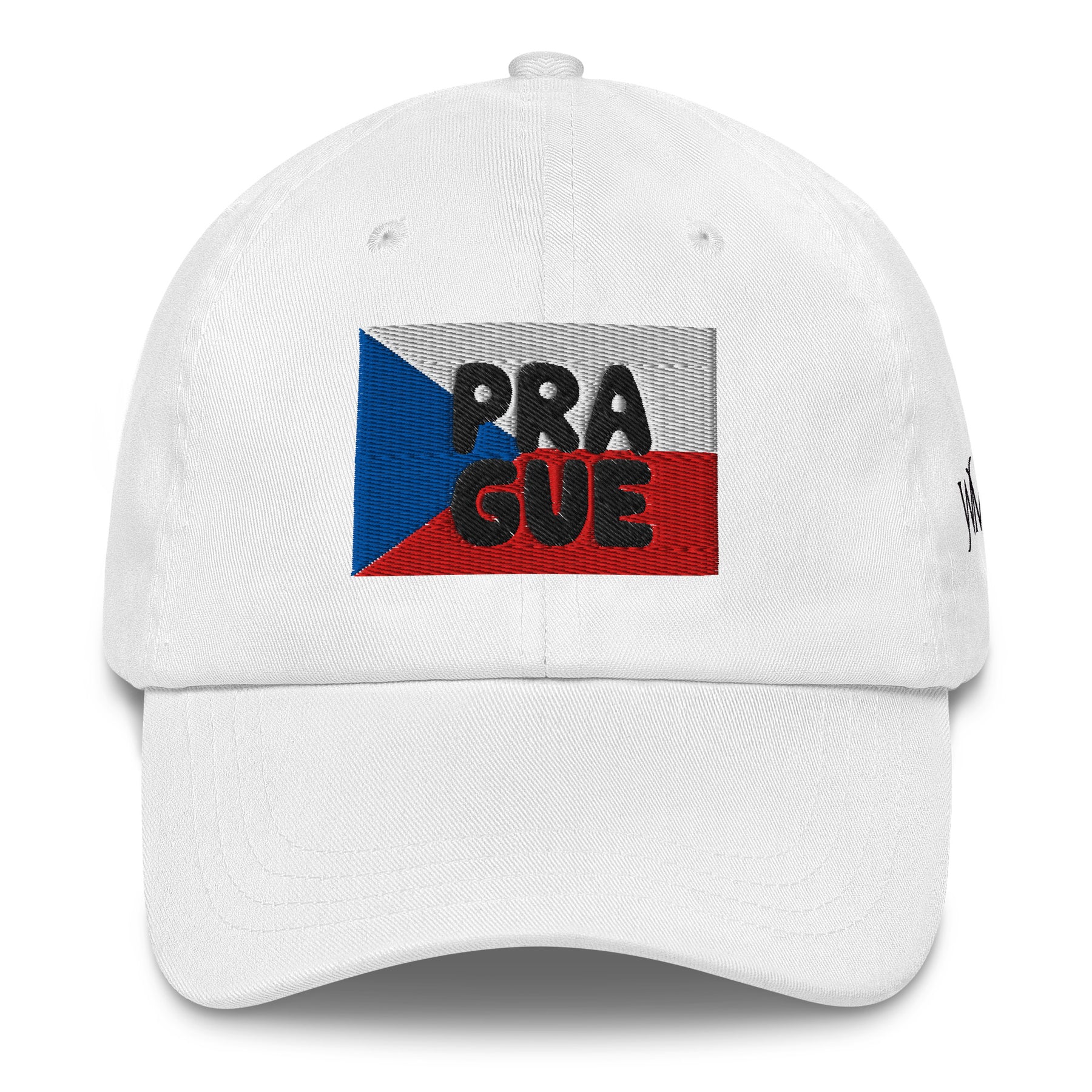 White classic cap with the word Prague embroidered over an embroidered flag of Czech Republic.