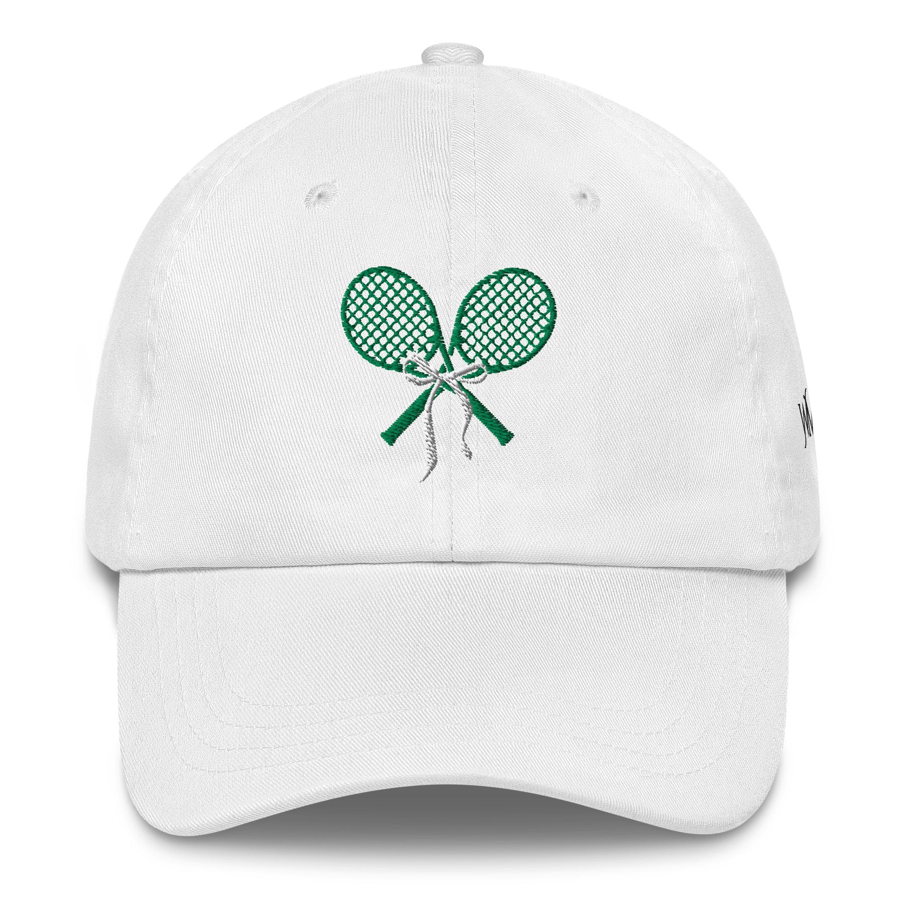 Serve up classic style with this white classic cap featuring two green embroidered tennis rackets, a nod to the timeless elegance of Wimbledon. Inspired by the prestigious tournament's all-white dress code, grab one of these caps on your next trip to Europe.